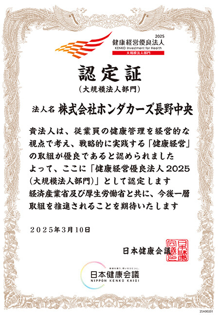 2025年3月10日、Honda Cars 長野中央は「健康経営優良法人(大規模法人部門)2025」の認定を取得いたしました。